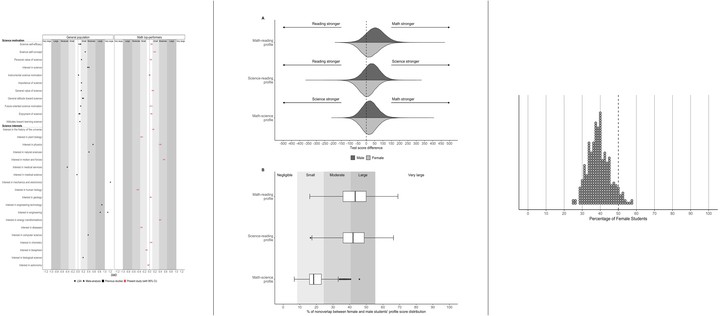 The present integrative data analysis examined gender differences in achievement, achievement profiles, and achievement motivation in mathematics, reading, and science among 113,864 top-performing adolescent math students (top 5% in their respective countries). To do this, we applied the same analysis protocol to representative individual participant data from six cycles of the Programme for International Student Assessment (PISA 2000–2015; 82 countries) and integrated the results by using meta-analytical random coefficient models. We found that in the group of top-performing math students, male students were overrepresented (mean female-to-male ratio 1:1.50, 95% CI [1:1.58, 1:1:43]). Furthermore, female students possessed better reading skills (mean d = –0.23, 95% CI [–0.25, –0.21]) and more positive reading attitudes (–0.64, 95% CI [–0.69, –0.60] ≤ mean d ≤ –0.38, 95% CI [–0.46, –0.30]). Male students had stronger math self-efficacy (mean d = 0.32, 95% CI [0.28, 0.35]) and demonstrated mathematics-oriented achievement profiles, whereas female students’ profiles were more balanced across domains. Moreover, female students were more interested in organic and medical fields (–0.44, 95% CI [–0.48, –0.40] ≤ mean d ≤ –0.30, 95% CI [–0.34, –0.25]), whereas male students showed greater interest in physics-related topics (0.39, 95% CI [0.36, 0.43] ≤ mean d ≤ 0.54, 95% CI [0.50, 0.58]). Gender equality indicators moderated the proportion of female students in the top 5% in mathematics and explained variability in achievement profiles across countries. Results are explained by social role theory and situated expectancy–value theory, and implications for women’s underrepresentation in (specific) STEM fields are discussed.
